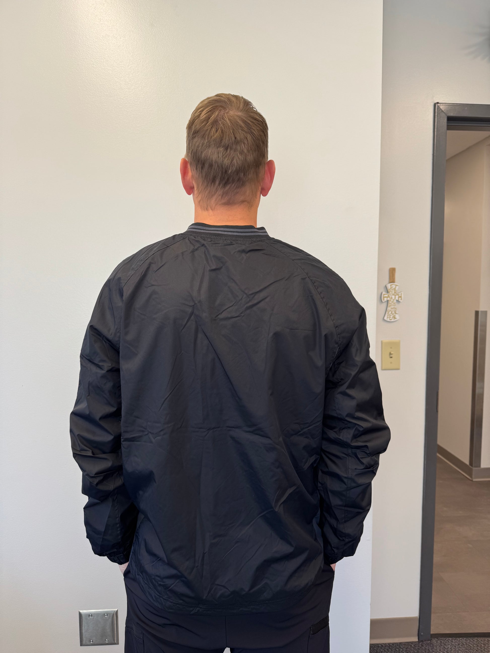 Black with graphite contrast - v-neck, 100% polyester with side zipper and draw string at waist